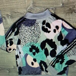 Vibrant jacket with abstract patterns. Features shades of black, green, and cream. Perfect for a bold look.