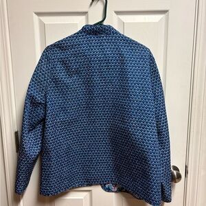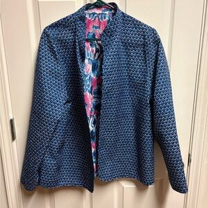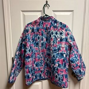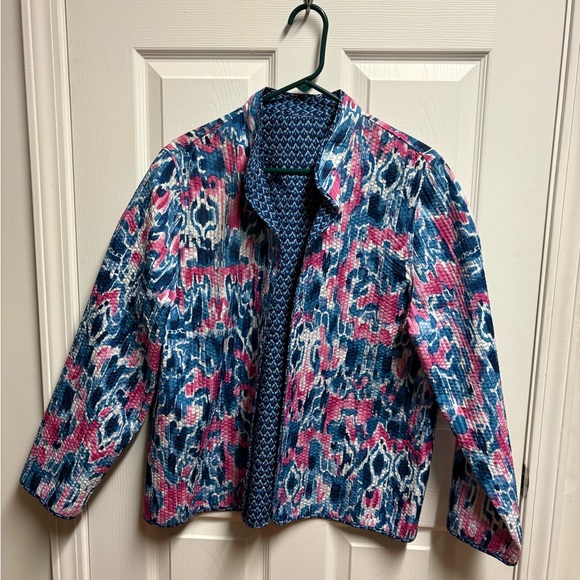 Vibrant jacket with a striking pattern. Features shades of blue, pink, and white. Perfect for adding a pop of color to any outfit.