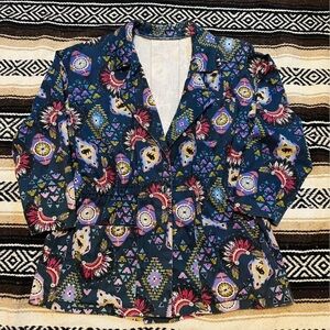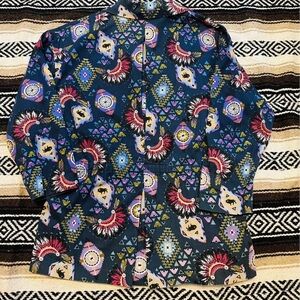Vibrant jacket with a unique pattern. Features a mix of colors including blue, pink, and yellow.