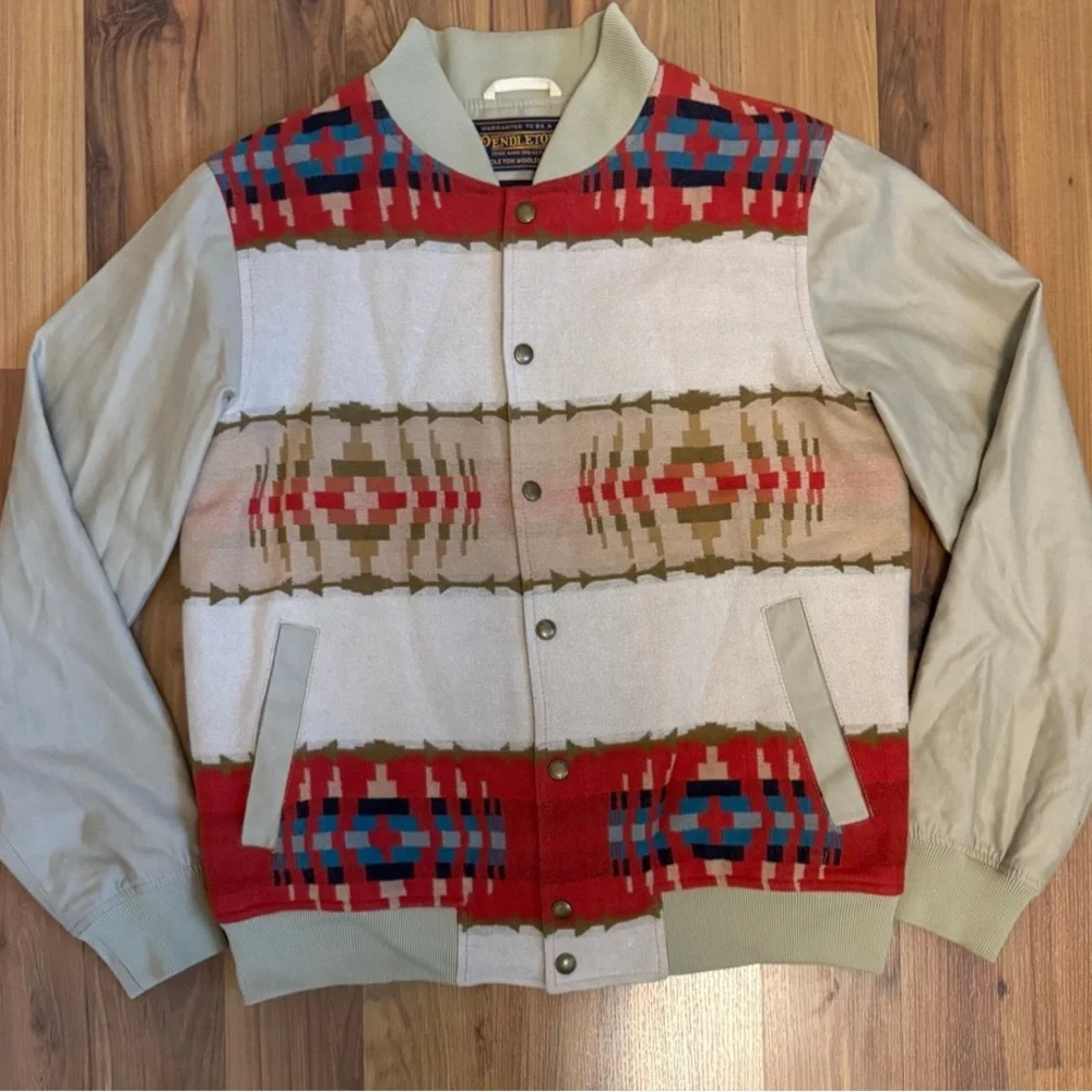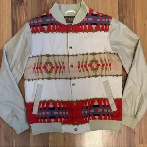 Stylish jacket with vibrant patterns. Features red, blue, and cream colors. Perfect for adding a pop of color to any outfit.
