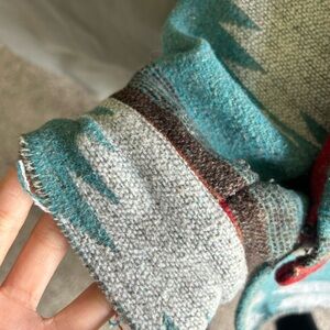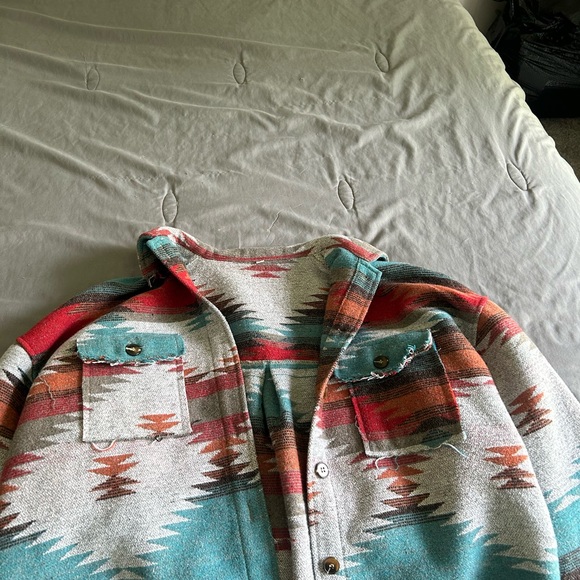 This vibrant jean jacket features a striking pattern with shades of red, blue, and gray. Perfect for adding a pop of color to your wardrobe.