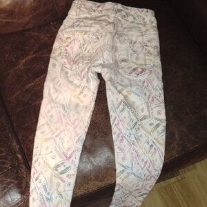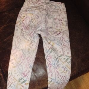 Stylish jeans with a colorful pattern. Features a unique design with various colors.