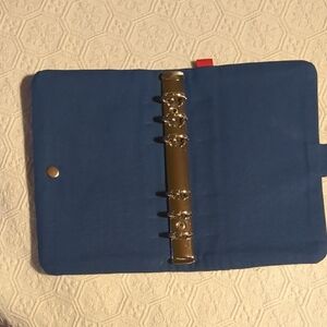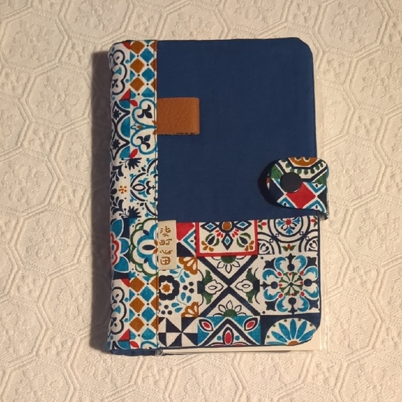 Vibrant journal with a mix of blue, brown, and multicolor patterns.