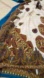 Vibrant kaftan dress with intricate patterns. Features a mix of white, blue, brown, and green colors.