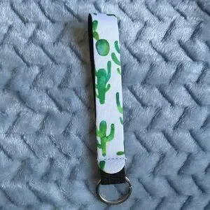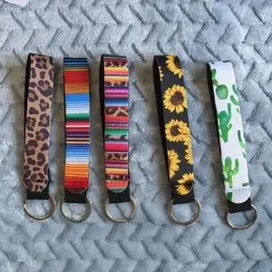 Set of five keychains with vibrant patterns. Includes leopard print, multicolor stripes, and sunflower designs. Perfect for adding style to your keys.