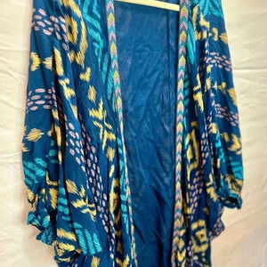 Vibrant kimono with a mix of blue, yellow, and pink patterns. Lightweight and stylish. Perfect for layering.