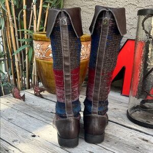 knee-high wool and leather boots. Features shades of red, blue, and brown. Very unique and comfortable