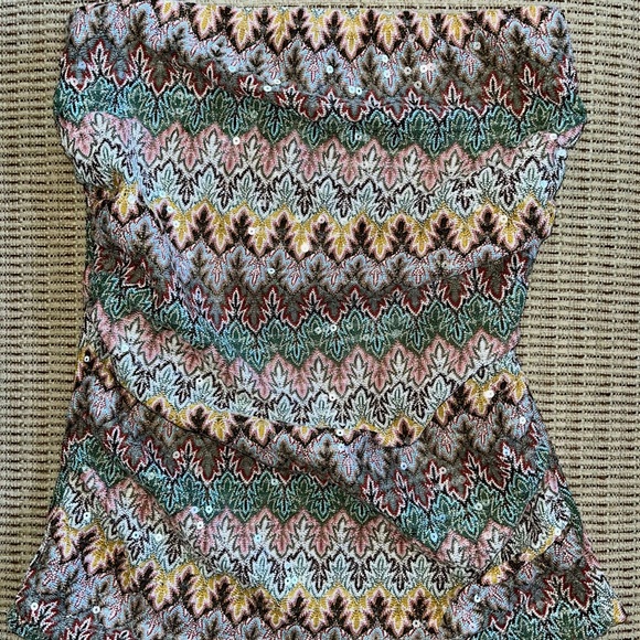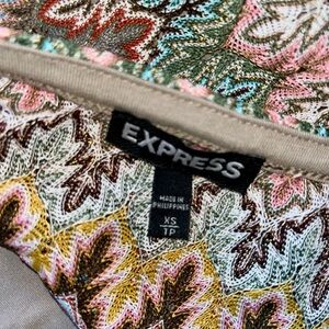 Vibrant knit top with a multicolor pattern. Features shades of green, yellow, pink, and brown.