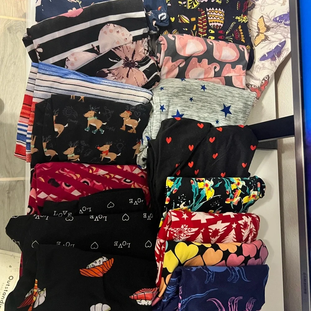 A vibrant collection of leggings featuring various patterns and colors. Perfect for adding a pop of color to your wardrobe.