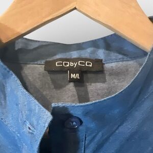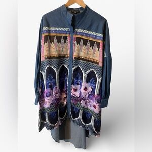 Stylish long shirt with vibrant patterns. Features shades of blue, purple, and black.