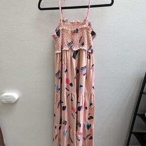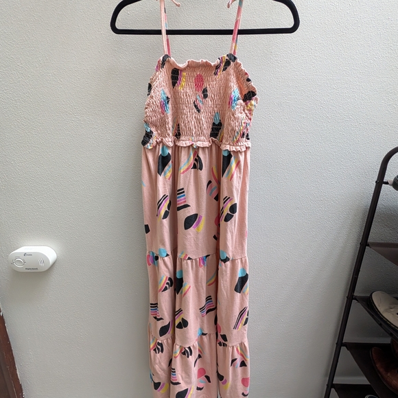Stylish maxi dress with a colorful abstract pattern. Features a smocked top and adjustable straps. Size says XL but fits like a Medium.