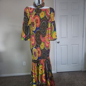 Vibrant and stylish, this maxi dress features a colorful pattern perfect for any occasion. The dress showcases a mix of pink, yellow, and blue hues, creating a lively and eye-catching look.