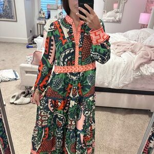 Vibrant maxi dress featuring a bold mix of green, pink, and orange patterns. Perfect for making a statement at any event.