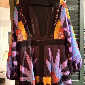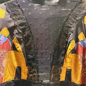 This vibrant maxi dress features a stunning mix of colors, perfect for making a statement. The dress combines shades of black, purple, and gold, creating a unique and eye-catching design. Ideal for any occasion, this dress offers both style and comfort. Low cut front and open back. NWOT. Smoke free home.