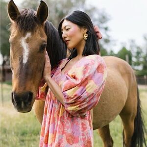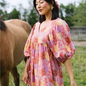 Twirl into any season with the Norma Dress in this charming red floral faces pattern! This boho inspired beauty features charming puffed sleeves, a flattering empire waist, and a classic v-neckline that's sure to turn heads. The mid-calf length adds a touch of elegance, while the flowing 100% cotton satin weave fabric keeps you comfortable from summer sunsets to crisp fall evenings and even winter gatherings. Who knew looking this fabulous could feel so effortless? Features multi-colored faces, grouped together to make an interesting array of facial florals.