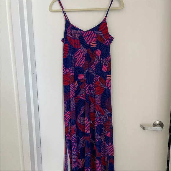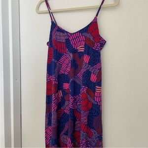 Vibrant mini dress featuring a striking red and blue pattern. Perfect for a bold, stylish look.