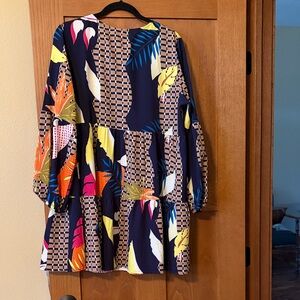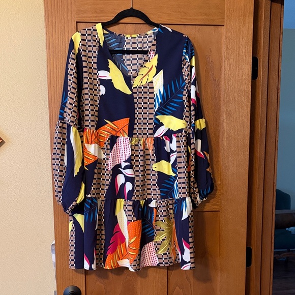Vibrant v-neck mini dress featuring a mix of colors including blue, yellow, and orange. Perfect for a bold and stylish look.