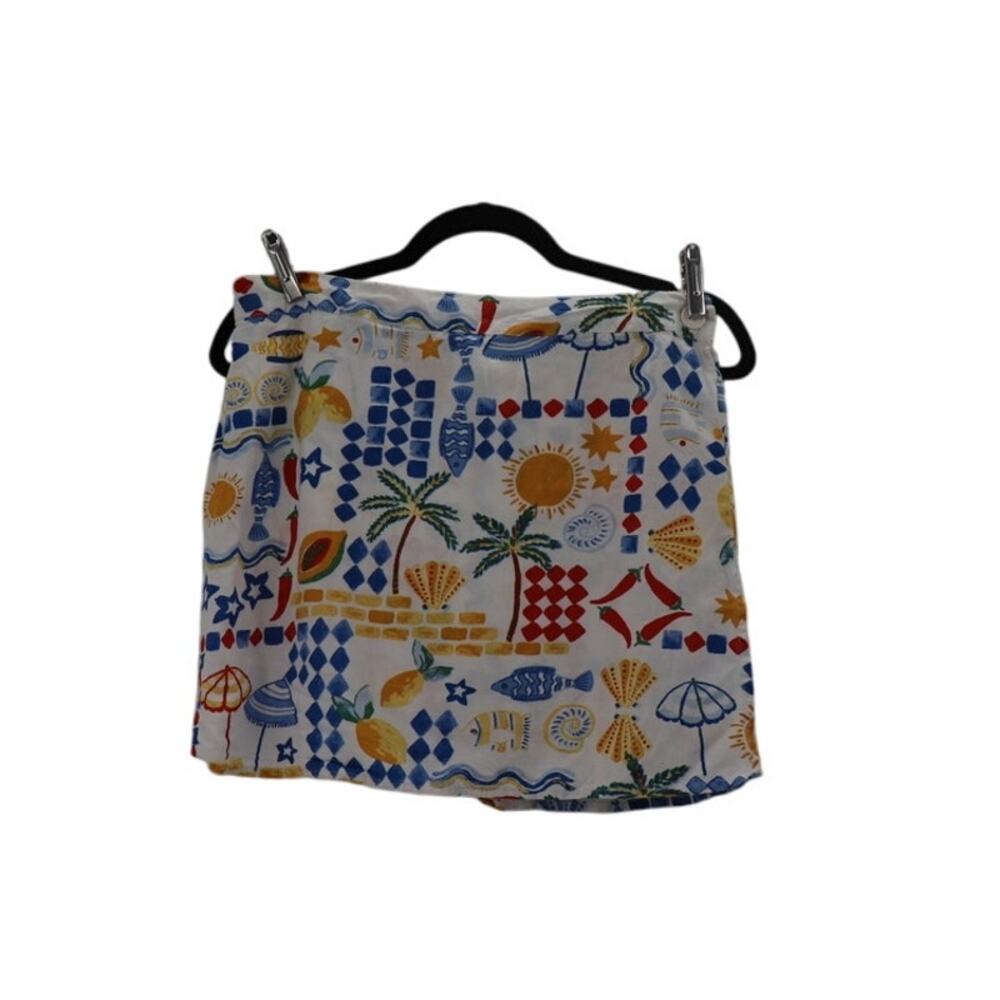 Vibrant mini skirt featuring a playful pattern with red, blue, and yellow accents. Perfect for adding a pop of color to your wardrobe.