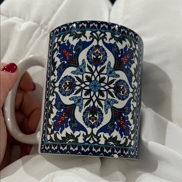 Vibrant mug with intricate blue and red patterns. Perfect for coffee or tea.