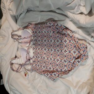 Vibrant one-piece swimsuit with a colorful geometric pattern. Perfect for a stylish beach day.