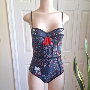 Make a splash in this eye-catching art print one-piece swimsuit featuring an eclectic mix of patterns and colors. With bustier-style seaming and a structured silhouette, it blends bold design with a flattering fit. The front showcases a red accent ruffle detail and vibrant elements like evil eye motifs, floral silhouettes, and abstract dots.