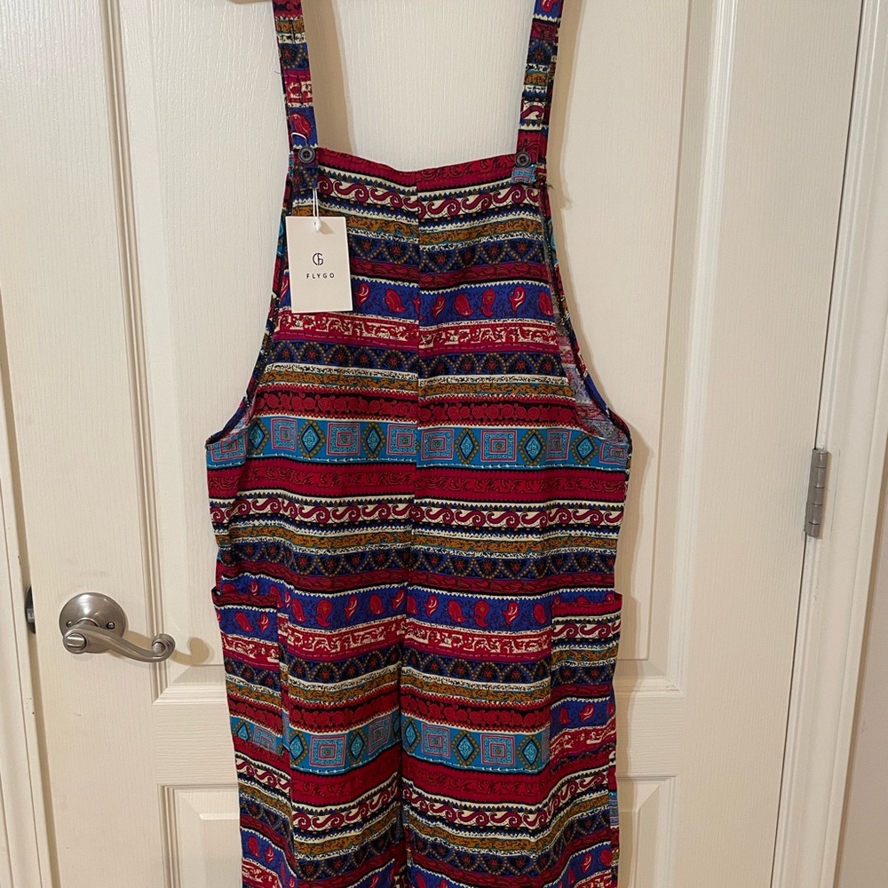 Vibrant overalls with a multicolor pattern. Features adjustable straps and a relaxed fit. Perfect for a bold fashion statement.