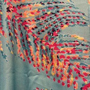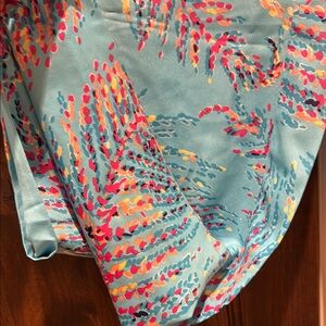 Vibrant pants with a multicolor abstract pattern. Features shades of blue, pink, and orange. Polyester
