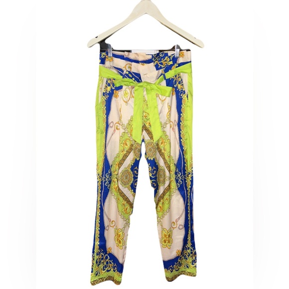 Vibrant pants with intricate patterns. Features blue, green, and cream colors.
