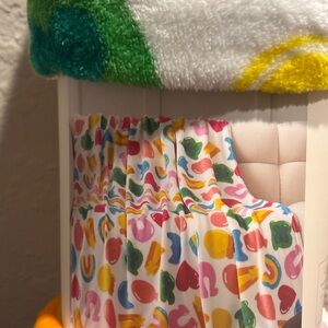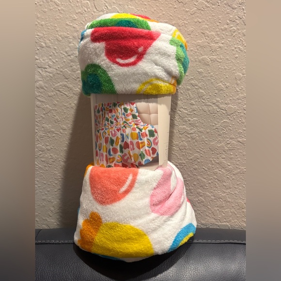 Soft plush throw with a vibrant multicolor pattern. Features red, yellow, green, and blue accents on a white base.