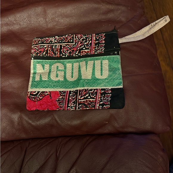Vibrant pouch with a bold pattern. Features red, black, and green colors.