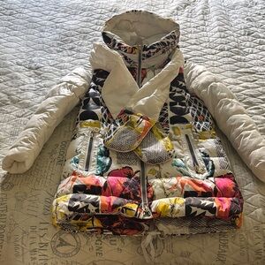 Vibrant puffer jacket with a mix of colors and patterns. Features a cozy hood and zippered pockets.Very excellent condition