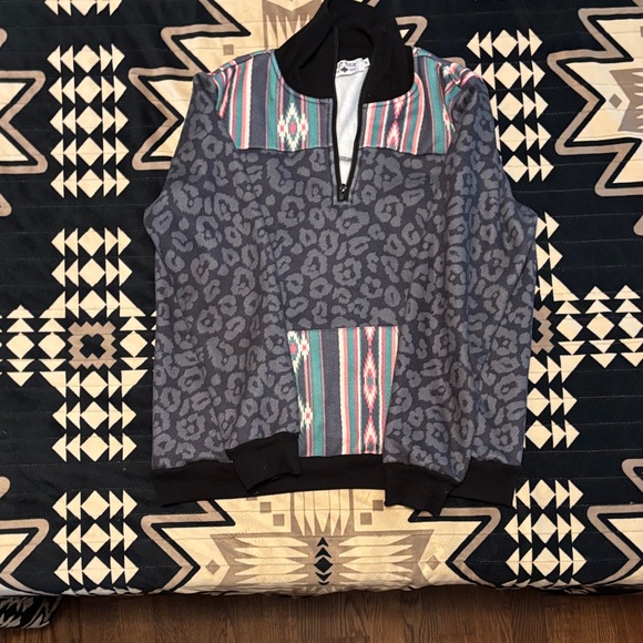 Stylish quarter-zip sweater with a colorful pattern. Features a mix of gray leopard print and vibrant stripes.