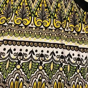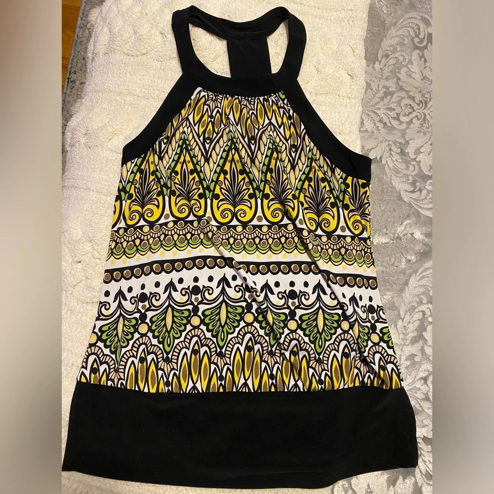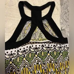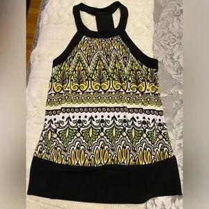 Vibrant sleeveless top with intricate patterns. Features black, yellow, and green designs. Never worn.