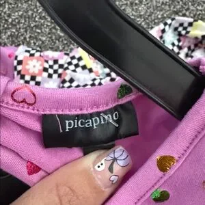 Set of two vibrant rompers. One features a pink base with multicolored dots. The other has a black and white checkered pattern with colorful accents. Perfect for a playful look.