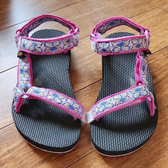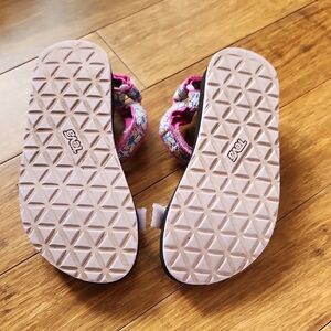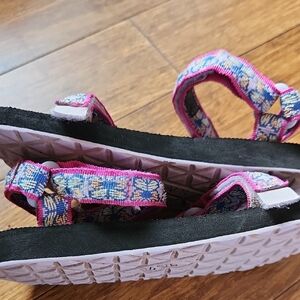 Great used condition girls Teva adjustable sandals. Minor frayed on inside strap as seen in last photo. Lots of life left.
