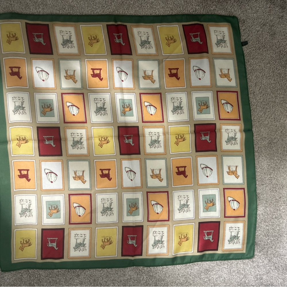 Vibrant scarf with a playful pattern. Features shades of green, red, yellow, and cream.