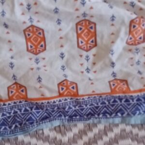 Vibrant scarf with intricate patterns. Features orange, purple, and white designs.