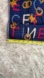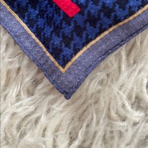 Vibrant scarf with a bold pattern. Features blue, red, and gold accents.