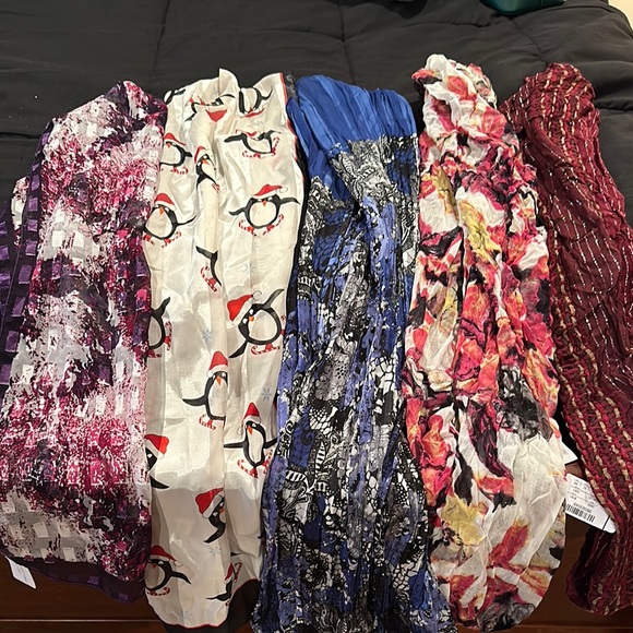 Set of five vibrant scarves. Features various patterns including penguins and abstract designs. Perfect for adding color to any outfit.