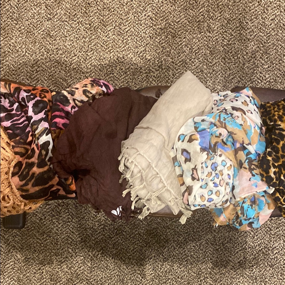 Six scarves. A vibrant collection of patterned scarves. Perfect for adding a pop of color to any outfit. Includes various designs and textures.Two are infinite.