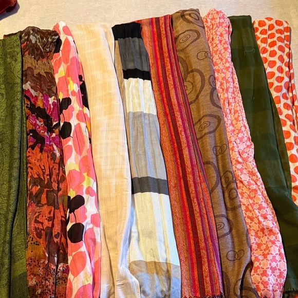 A vibrant collection of colorful patterned scarves. Perfect for adding a pop of color to any outfit. 10 scarves in total!