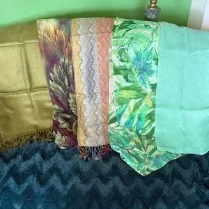 Set of vibrant scarves featuring green, multicolor patterns, and gold tones. Perfect for adding a pop of color to any outfit. All of the scarves are made from a variety of fabrics and are different sizes. Scarves have been stored in a protective bag and are from a smoke free home.