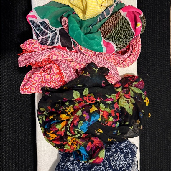 Set of vibrant scarves with floral and geometric patterns. Perfect for adding a pop of color to any outfit. $10 for all or $3 each.