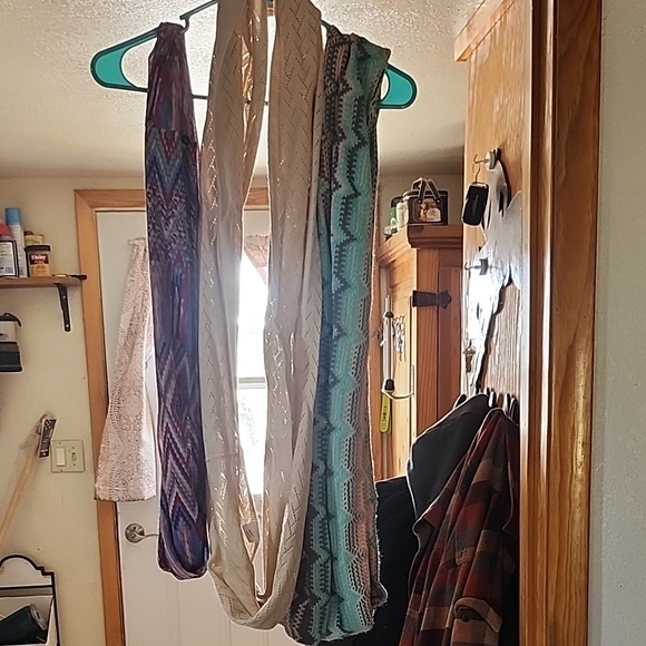 Set of three stylish scarves. Features vibrant patterns in multiple colors. Perfect for adding flair to any outfit.