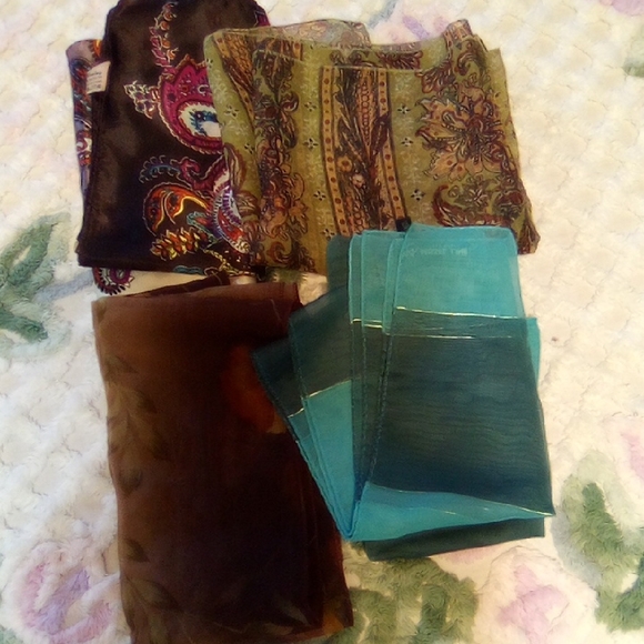 Set of vibrant scarves with paisley and abstract patterns. Includes shades of green, teal, brown, and multicolor designs.