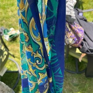 Set of vibrant scarves with plaid, floral, and abstract patterns. Features shades of yellow, gray, and blue.