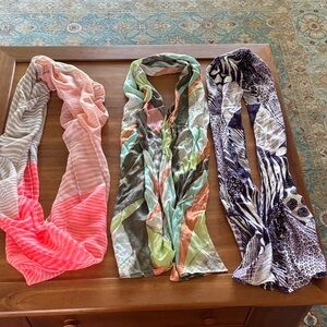 Enhance your style with this set of vibrant scarves. Featuring pink, green, and purple patterns, these accessories add a pop of color to any outfit. 1 infinity, 2 six feet length