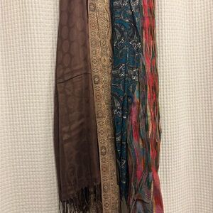 Set of 4 colorful patterned scarves. Includes brown, tan, blue, and multicolor designs. Perfect for adding style to any outfit.