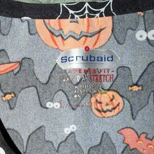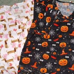 Set of colorful scrub tops with various fun patterns. Includes designs with pumpkins, animals, and abstract prints. Perfect for adding a playful touch to your work attire.