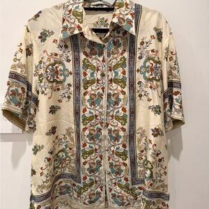 Vibrant shirt with intricate patterns. Features a mix of colors including cream, green, and orange.
